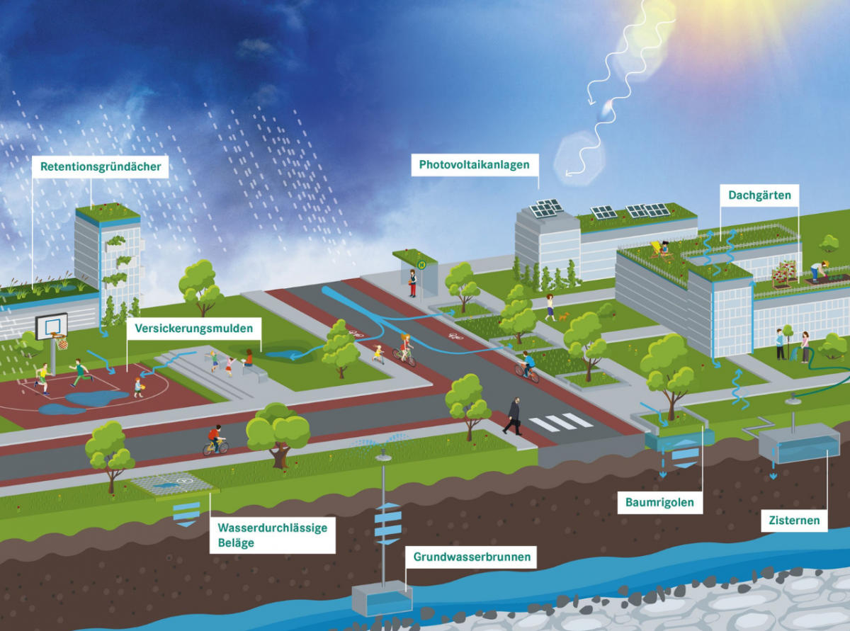 Per Gesetz muss in Berliner Neubaugebieten der Großteil des Wassers vor Ort versickern, gespeichert werden oder verdunsten. Es darf nur so viel Wasser in die Kanalisation geleitet werden, wie vor der Bebauung. Kurz gesagt: bei Neubauprojekten müssen Architekt*innen das Schwammstadtkonzept anwenden.