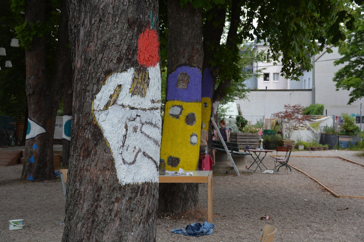 Die Schüler*innen einer fünften Klasse der Mittelschule an der Fromundstraße verwandelten im Jahr 2017 den Giesinger Grünspitz in ein farbenfrohes Kunstwerk. Gemeinsam mit dem „Kreativo“-Netzwerk brachten die Schüler*innen ein aus der Waldpädagogik stammende Konzept mitten in den urbanen Raum und malten auf die Kastanienbäume des Giesinger Grünspitz einzigartige Bilder. Das Besondere daran: Die verschiedenen Teilbilder auf den Baumstämmen ergaben aus bestimmten Blickwinkeln ein zusammenhängendes Kunstwerk. Der Wald der Bilder wurde mit für die Bäume unschädlicher Farbe gemalt, die die Schüler*innen vor Ort aus Kalk, Quark und natürlichen Farbpigmenten angemischt haben.